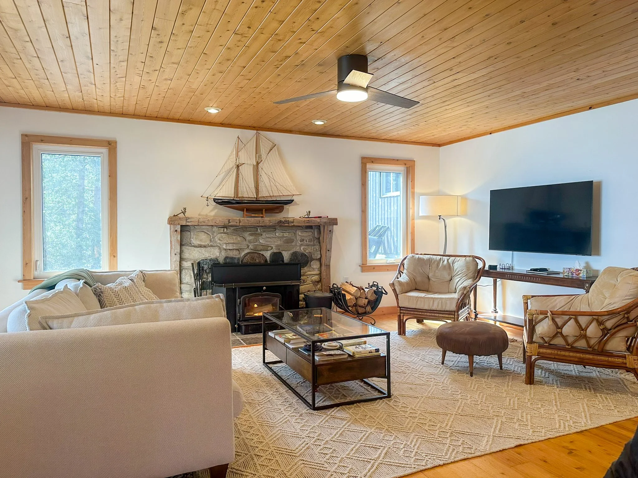 ✣ Cozy main floor living room with an indoor fireplace, smart TV, and classic cottage books